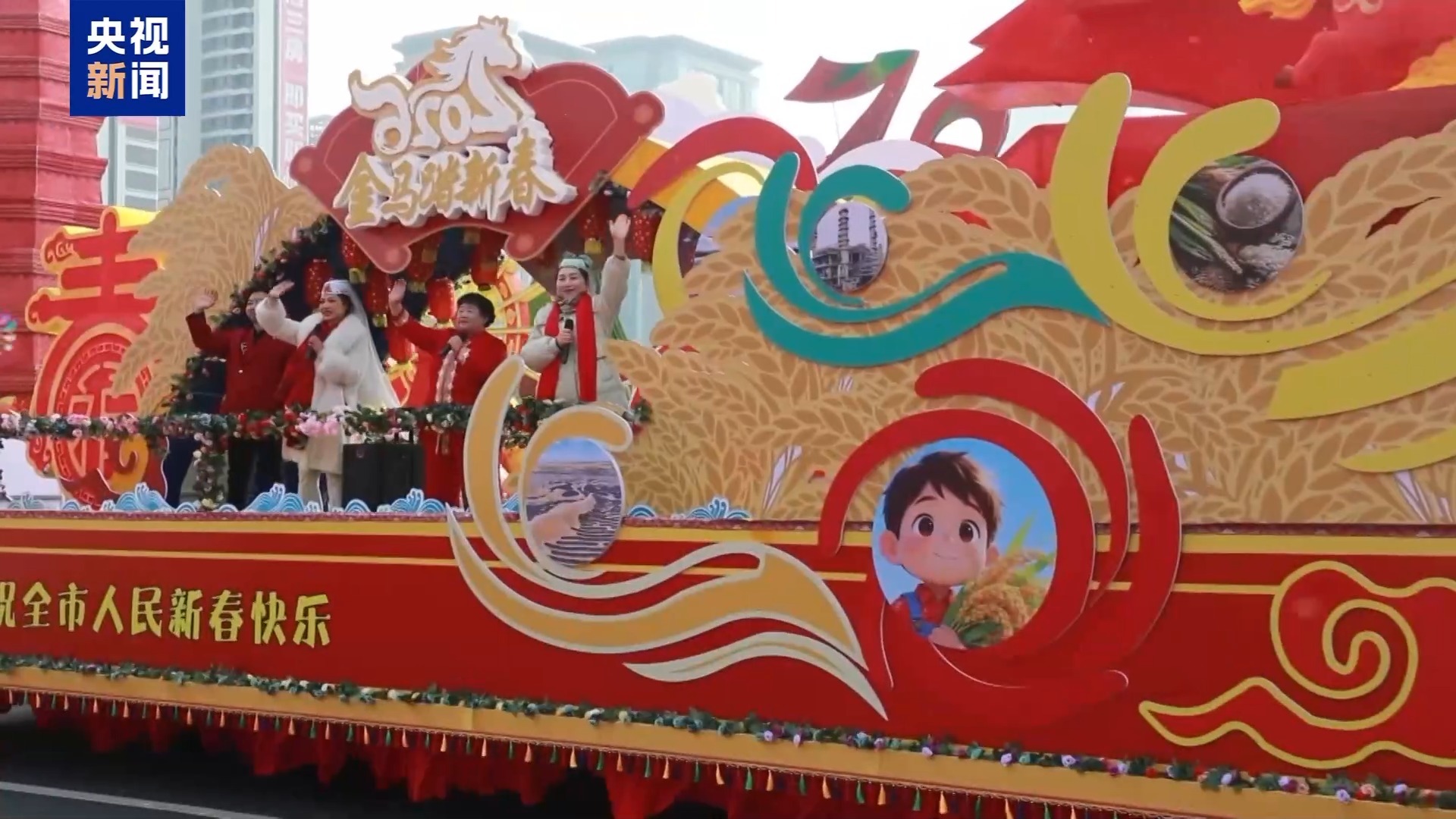 在新疆乌鲁木齐的文化中心广场,当地正在进行“打起手鼓舞起龙”的社火巡游活动。除了锣鼓喧天的社火氛围之外,还有一台台装饰一新的巡游花车,它们会作为这场社火巡游的移动舞台和故事主线,把新疆歌舞、马文化以及舞龙舞狮等元素串联起来。